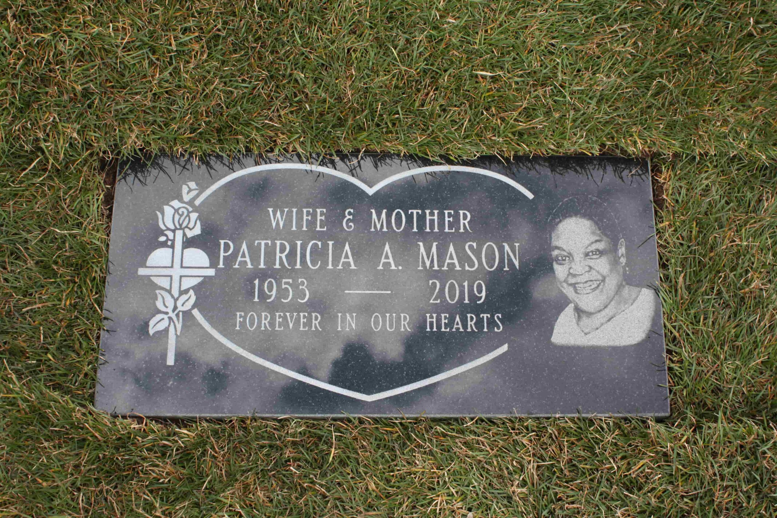 This marker is shown in jet black granite with a hand engraved portrait in a heart shaped panel. Give us your favorite photo and we will engrave the portrait in stone for a beautiful, timeless tribute. This style memorial sits flush with the ground and is meant to be centered on one grave.
