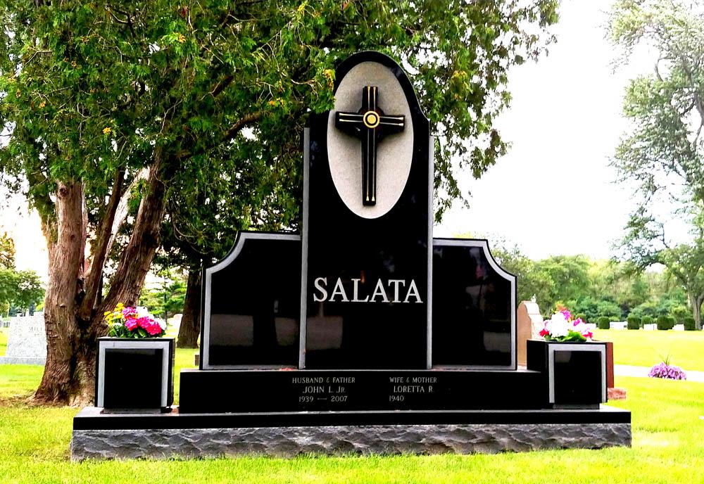 Black granite family monument with bronze cross and custom vases