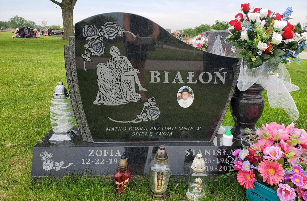 Black monument with engraved roses and Pieta design