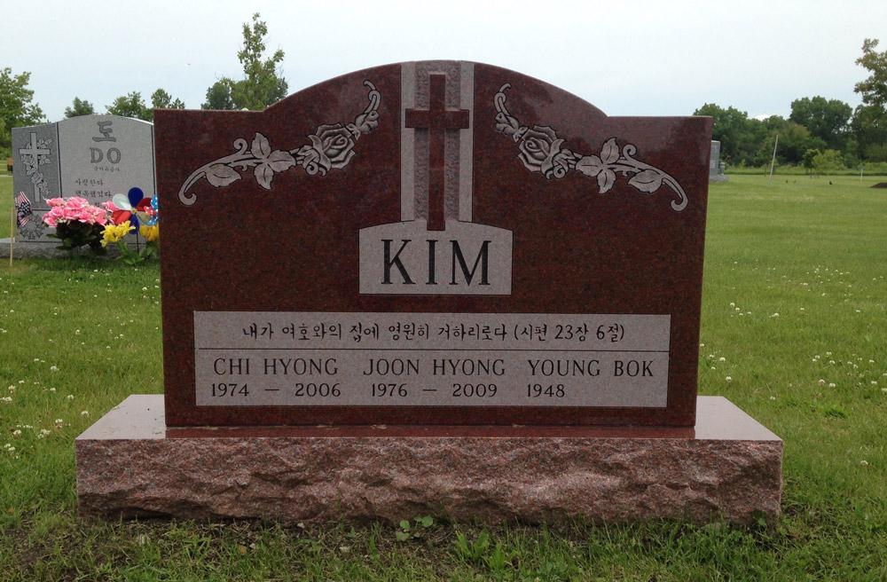 Red granite monument with raised cross and Korean inscription